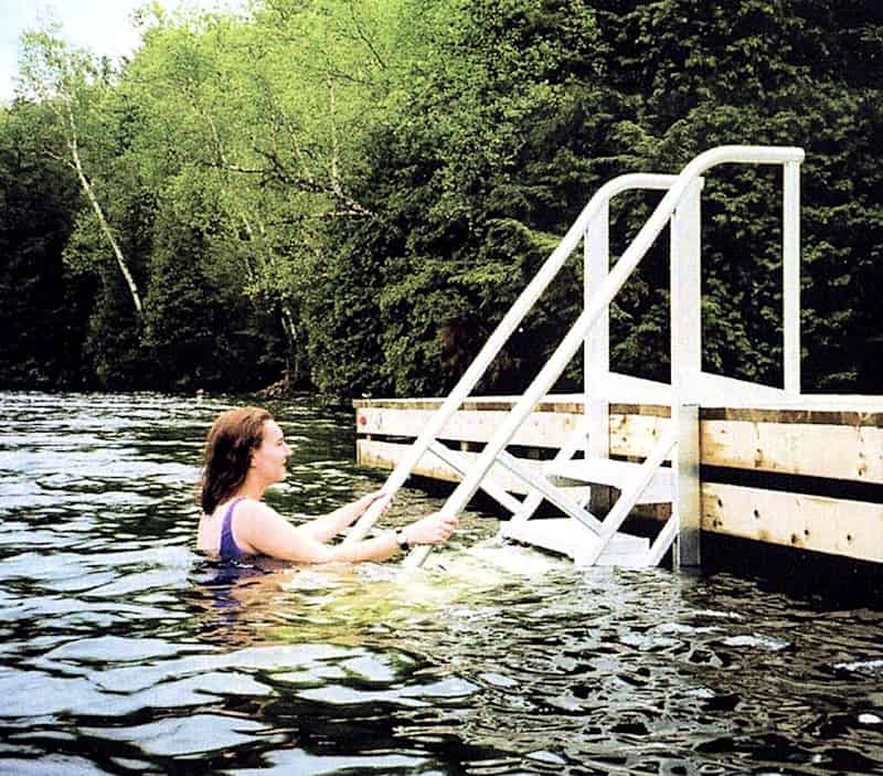 The Dock Stairs allow you to swim up and stand while still in the water, then easily exit up the stairs. Very little strain is put on the body; no lifting or pulling up and out is necessary.